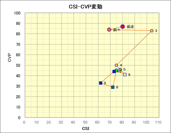 近走における4コーナーでの位置取りと上がり順位(頭数補正後) |