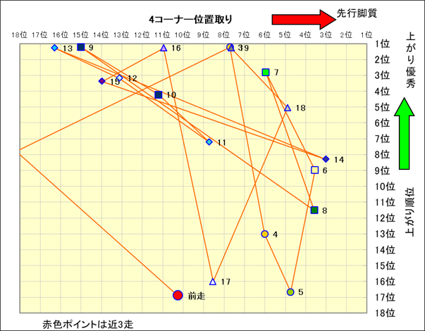 近走における4コーナーでの位置取りと上がり順位(頭数補正後) |