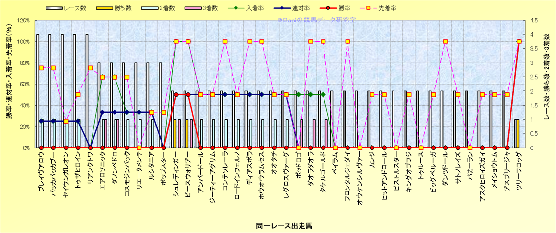 ライバル(相性)解析 同一レースに下記馬が出走した場合の成績とその馬に先着する先着率 |