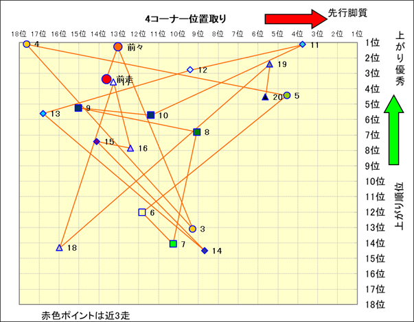脚質解析 近20レースの4コーナーでの位置取りと上がり順位(頭数補正後) |