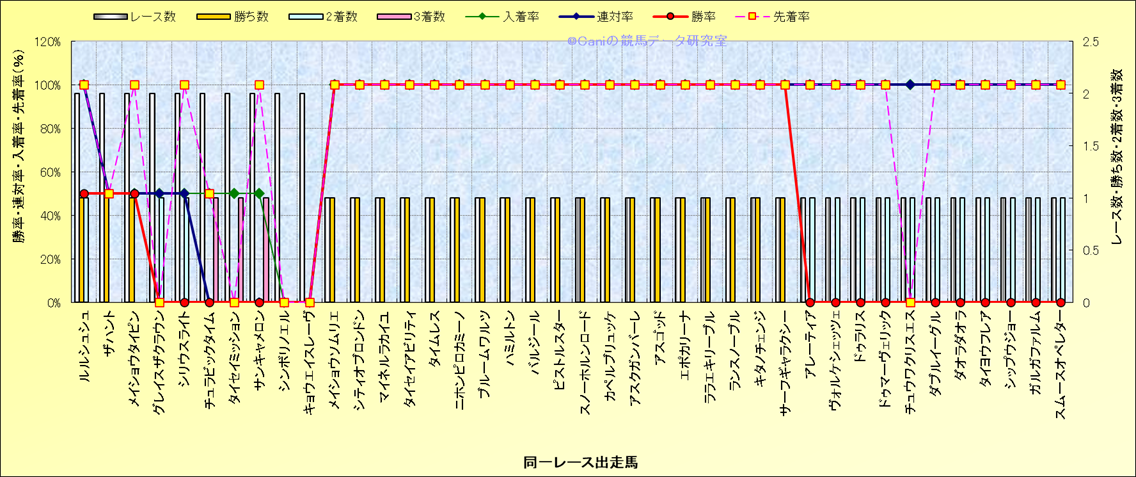 ライバル(相性)解析 同一レースに下記馬が出走した場合の成績とその馬に先着する先着率 |