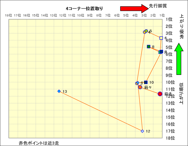 近走における4コーナーでの位置取りと上がり順位(頭数補正後) |