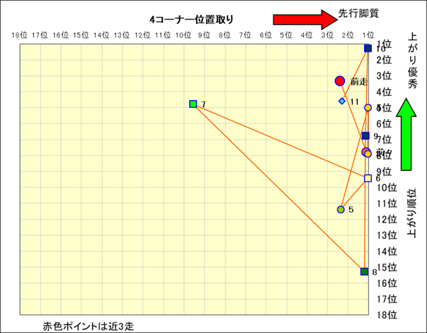 近走における4コーナーでの位置取りと上がり順位(頭数補正後) |