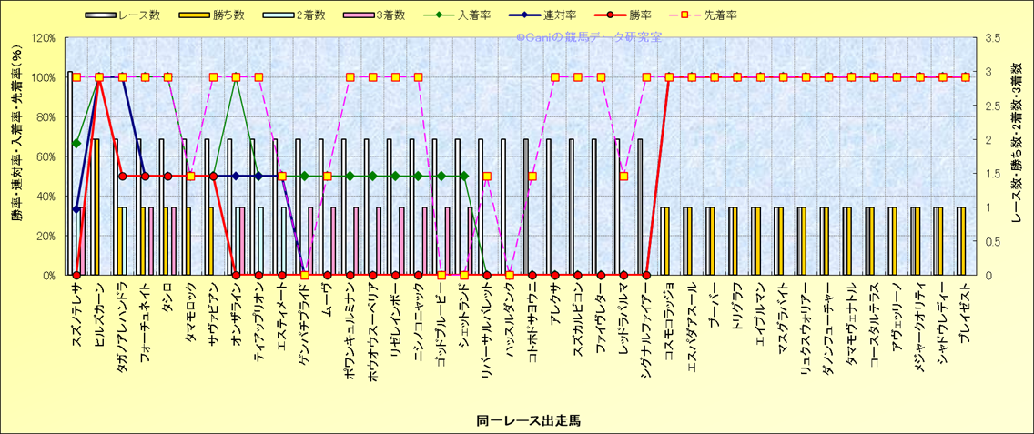 ライバル(相性)解析 同一レースに下記馬が出走した場合の成績とその馬に先着する先着率 |