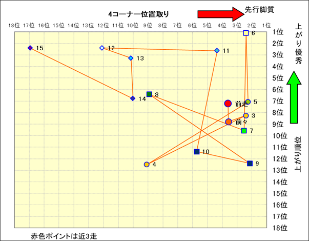 近走における4コーナーでの位置取りと上がり順位(頭数補正後) |