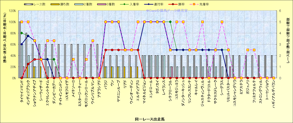 ライバル(相性)解析 同一レースに下記馬が出走した場合の成績とその馬に先着する先着率 |