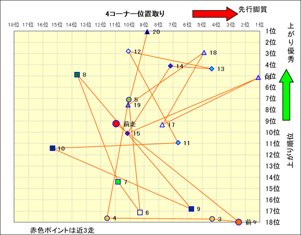 脚質解析 近20レースの4コーナーでの位置取りと上がり順位(頭数補正後) |