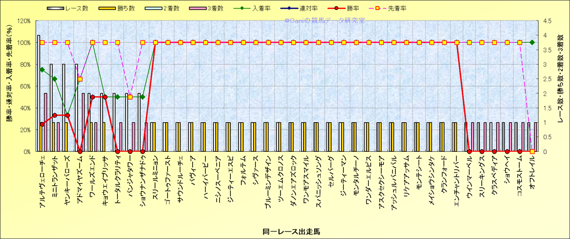 ライバル(相性)解析 同一レースに下記馬が出走した場合の成績とその馬に先着する先着率 |