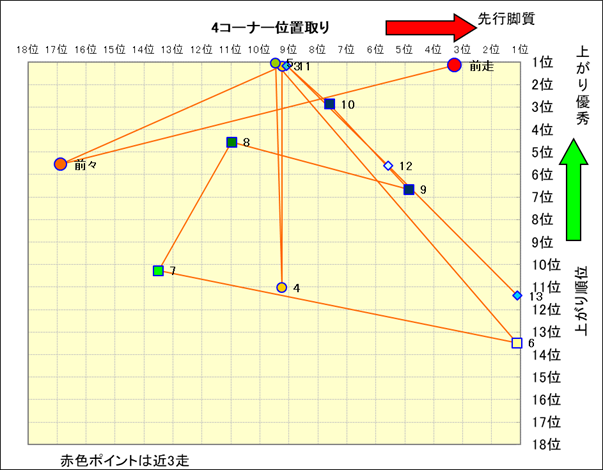 近走における4コーナーでの位置取りと上がり順位(頭数補正後) |