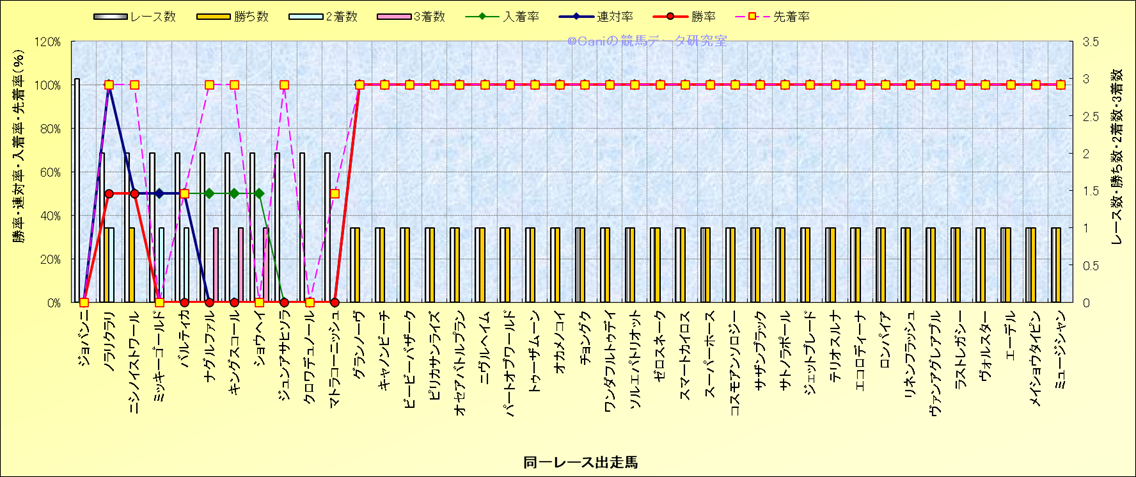 ライバル(相性)解析 同一レースに下記馬が出走した場合の成績とその馬に先着する先着率 |