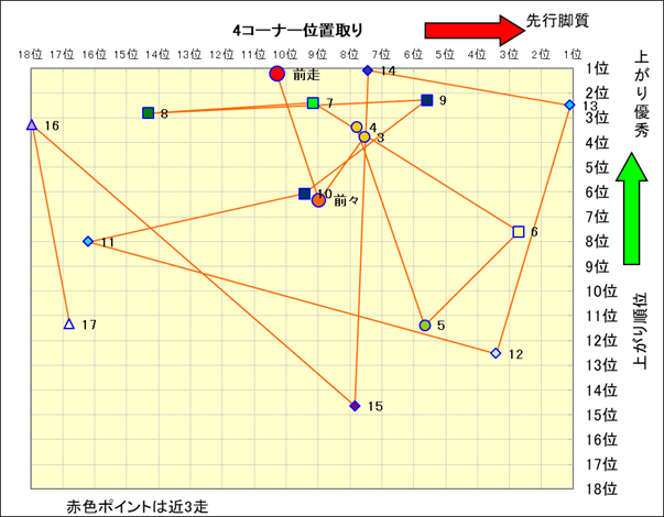 近走における4コーナーでの位置取りと上がり順位(頭数補正後) |
