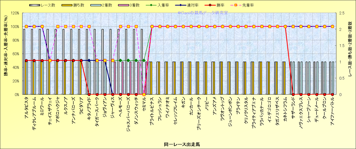 ライバル(相性)解析 同一レースに下記馬が出走した場合の成績とその馬に先着する先着率 |