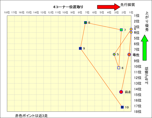 近走における4コーナーでの位置取りと上がり順位(頭数補正後) |