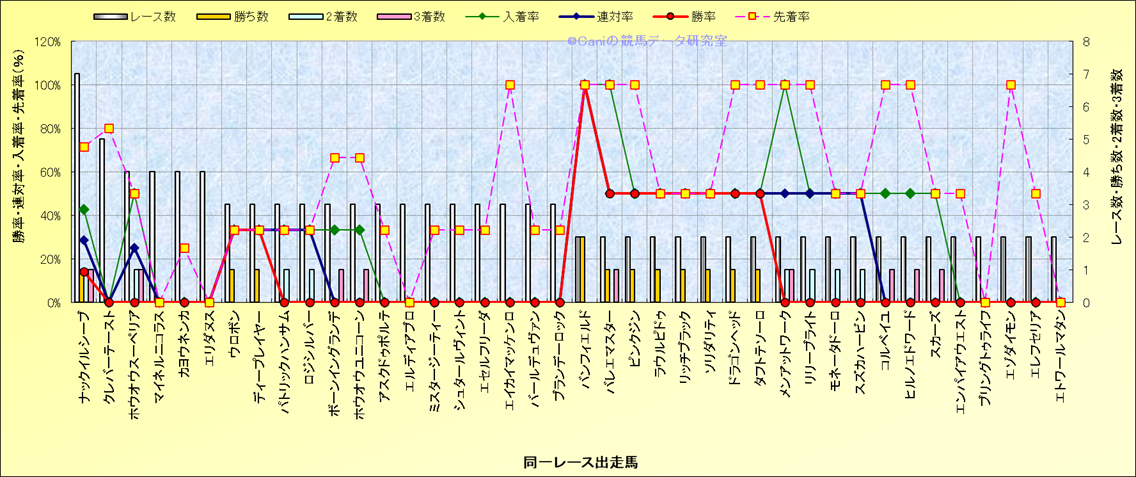 ライバル(相性)解析 同一レースに下記馬が出走した場合の成績とその馬に先着する先着率 |