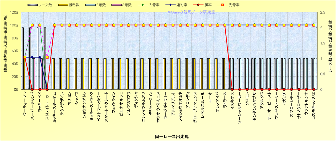 ライバル(相性)解析 同一レースに下記馬が出走した場合の成績とその馬に先着する先着率 |