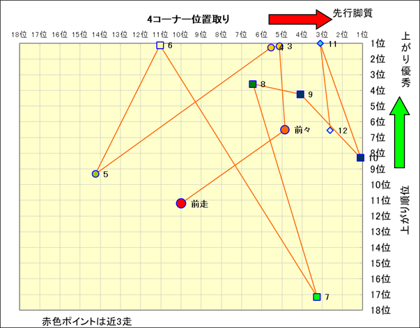 近走における4コーナーでの位置取りと上がり順位(頭数補正後) |