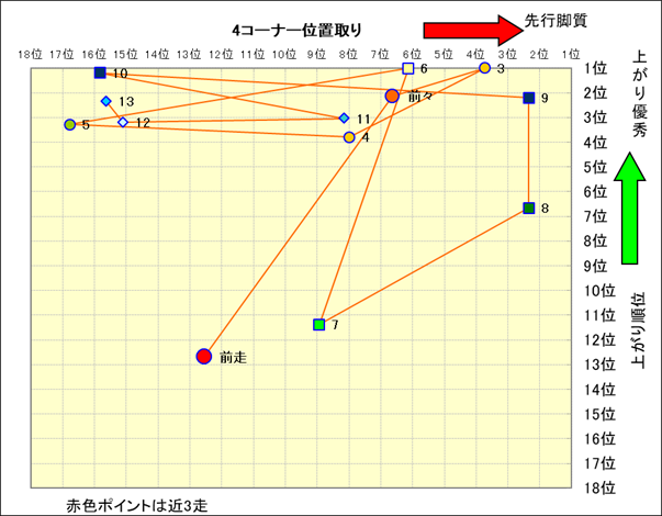 近走における4コーナーでの位置取りと上がり順位(頭数補正後) |