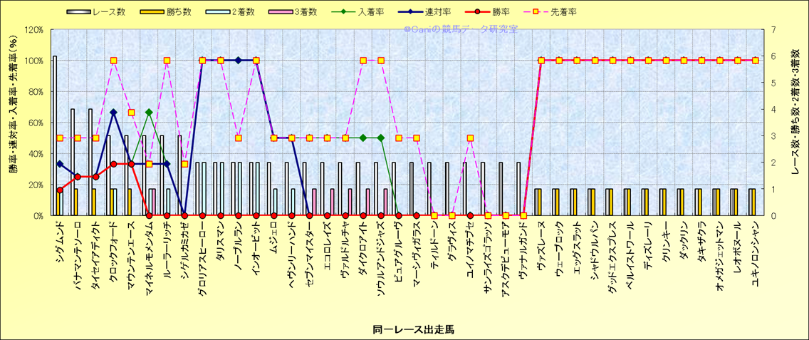 ライバル(相性)解析 同一レースに下記馬が出走した場合の成績とその馬に先着する先着率 |