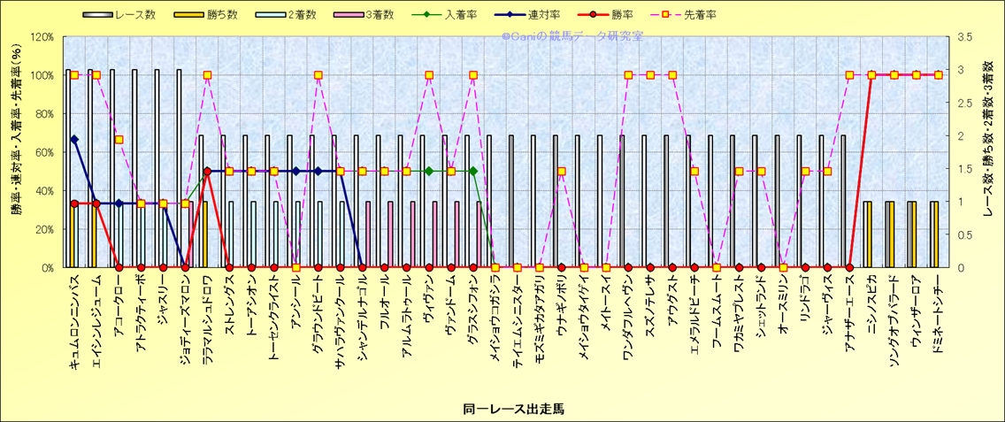 ライバル(相性)解析 同一レースに下記馬が出走した場合の成績とその馬に先着する先着率 |