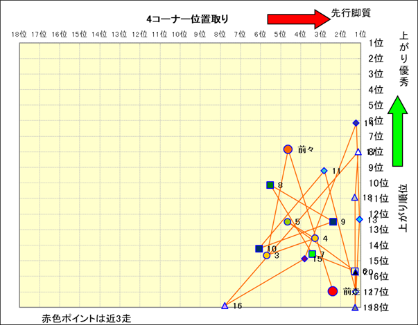 近走における4コーナーでの位置取りと上がり順位(頭数補正後) |