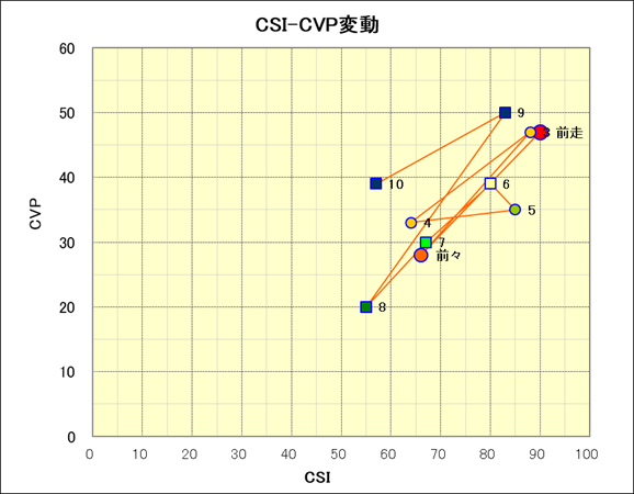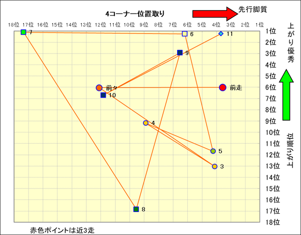 近走における4コーナーでの位置取りと上がり順位(頭数補正後) |
