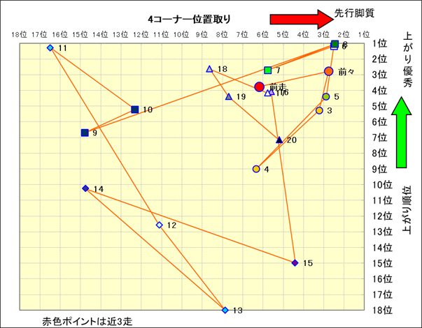 脚質解析 近20レースの4コーナーでの位置取りと上がり順位(頭数補正後) |