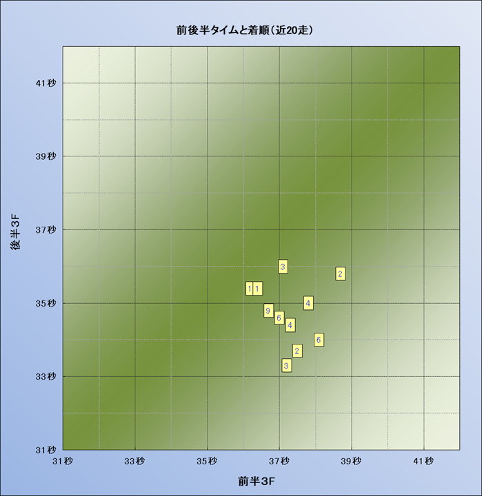 脚質解析 近20レースの4コーナーでの位置取りと上がり順位(頭数補正後) |