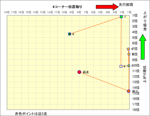 近走における4コーナーでの位置取りと上がり順位(頭数補正後) |