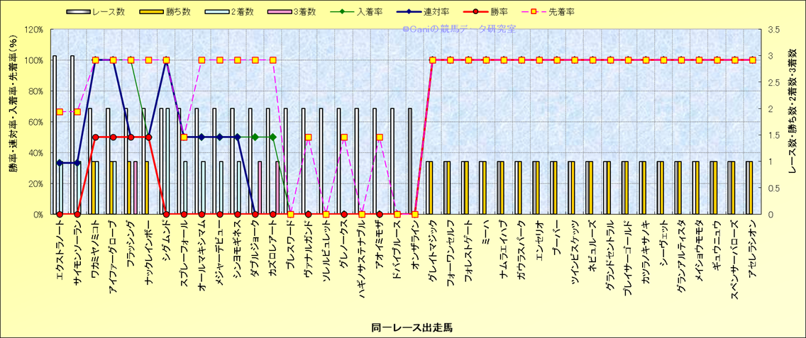 ライバル(相性)解析 同一レースに下記馬が出走した場合の成績とその馬に先着する先着率 |