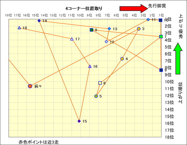 近走における4コーナーでの位置取りと上がり順位(頭数補正後) |