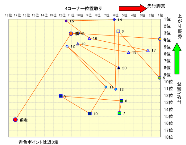 脚質解析 近20レースの4コーナーでの位置取りと上がり順位(頭数補正後) |