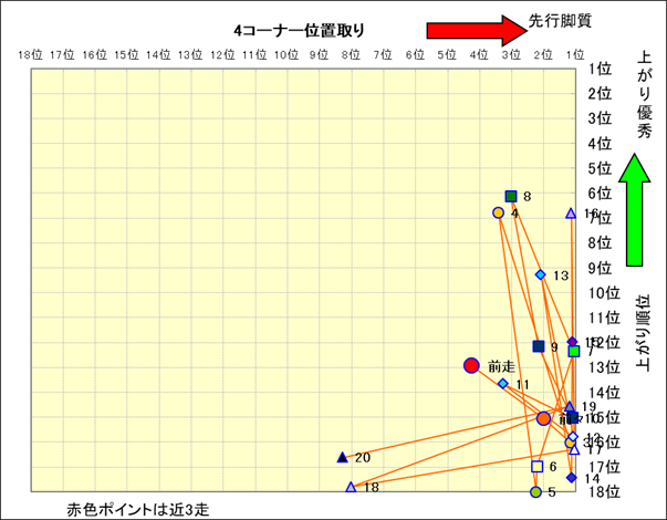 脚質解析 近20レースの4コーナーでの位置取りと上がり順位(頭数補正後) |
