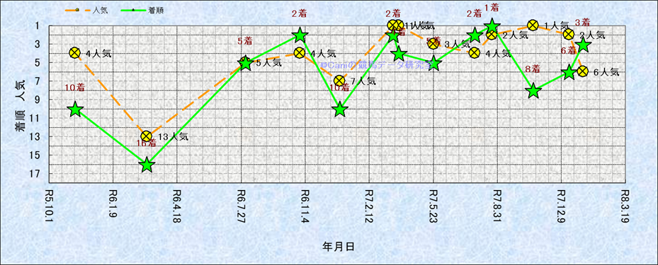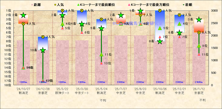 脚質解析 近20レースの4コーナーでの位置取りと上がり順位(頭数補正後) |