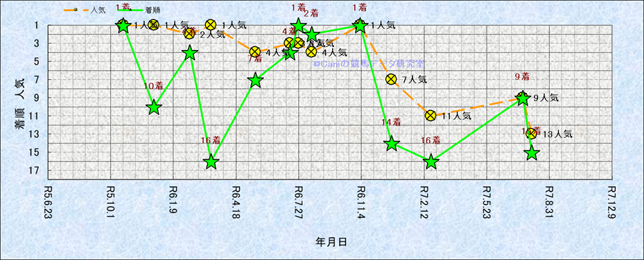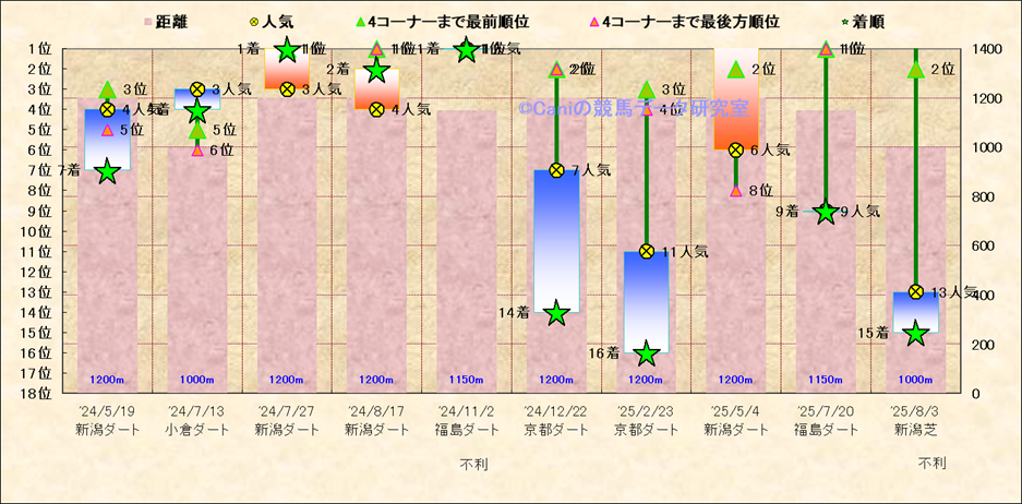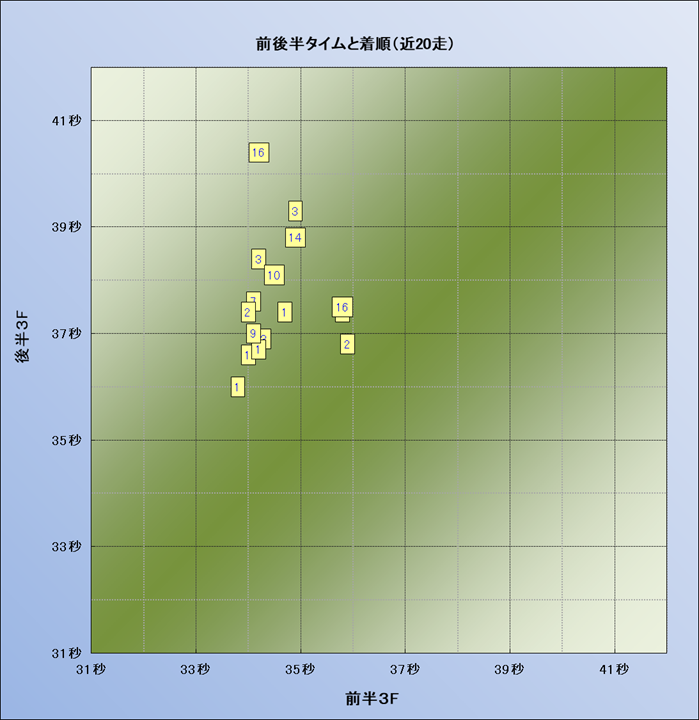 脚質解析 近20レースの4コーナーでの位置取りと上がり順位(頭数補正後) |
