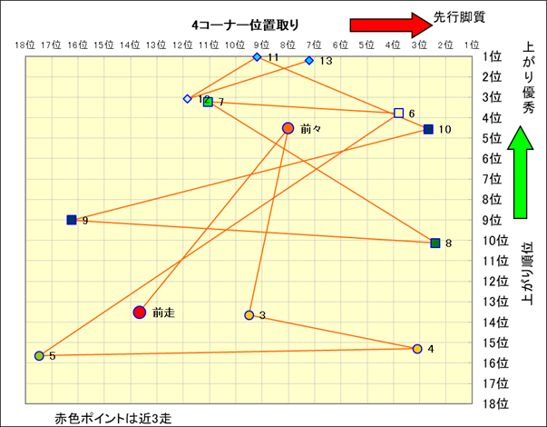 近走における4コーナーでの位置取りと上がり順位(頭数補正後) |
