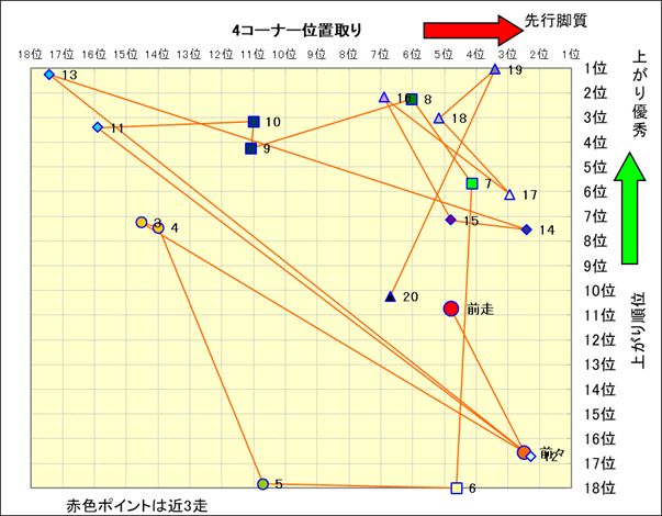 脚質解析 近20レースの4コーナーでの位置取りと上がり順位(頭数補正後) |