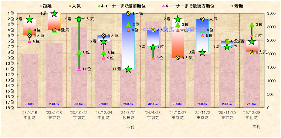 脚質解析 近20レースの4コーナーでの位置取りと上がり順位(頭数補正後) |