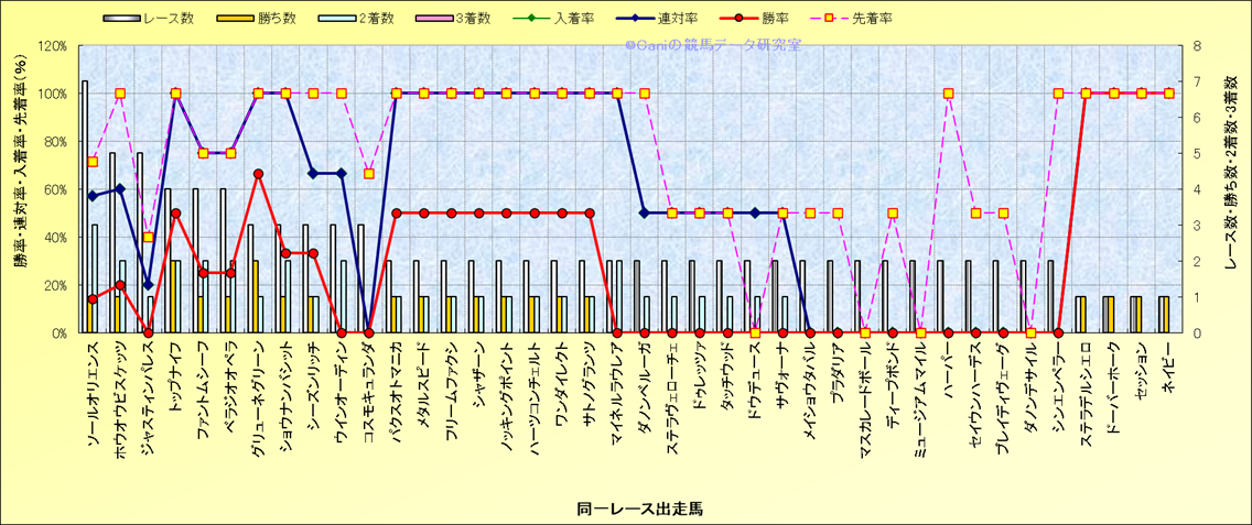 ライバル(相性)解析 同一レースに下記馬が出走した場合の成績とその馬に先着する先着率 |