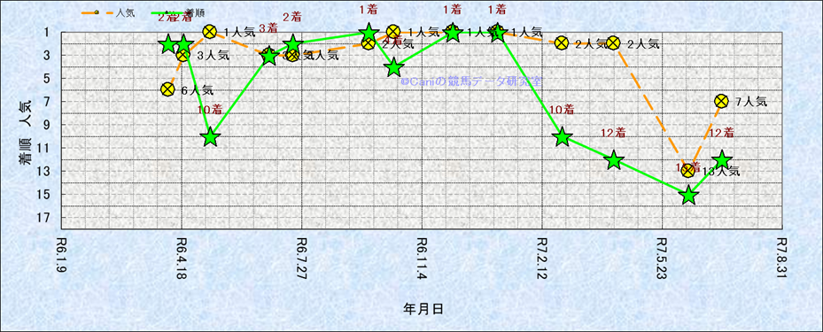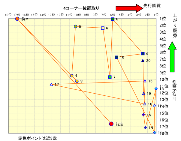 近走における4コーナーでの位置取りと上がり順位(頭数補正後) |