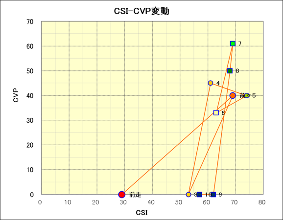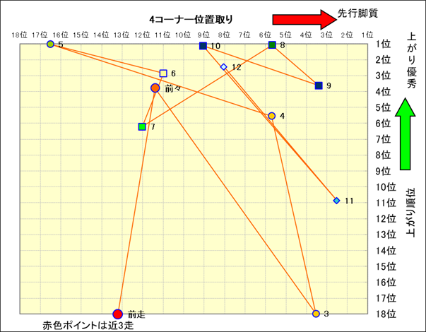 近走における4コーナーでの位置取りと上がり順位(頭数補正後) |