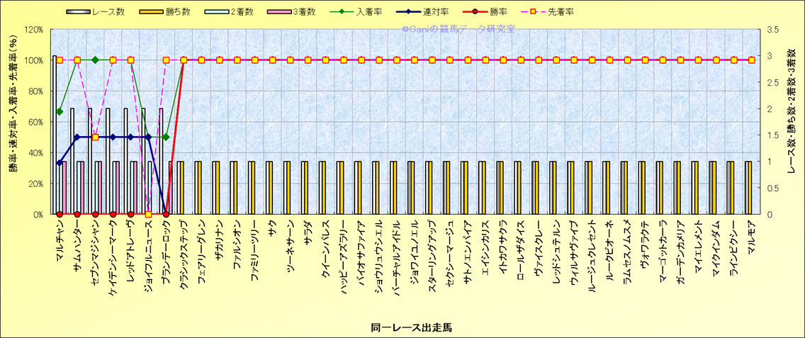 ライバル(相性)解析 同一レースに下記馬が出走した場合の成績とその馬に先着する先着率 |