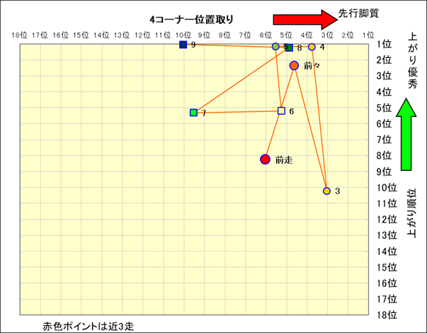 近走における4コーナーでの位置取りと上がり順位(頭数補正後) |