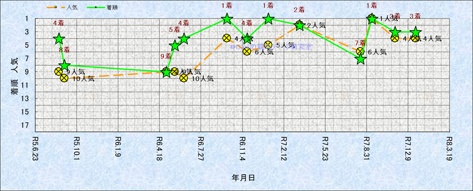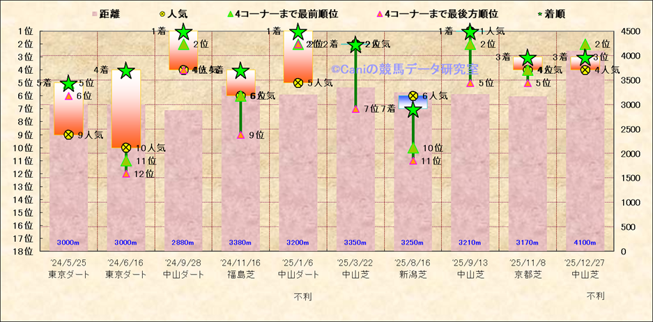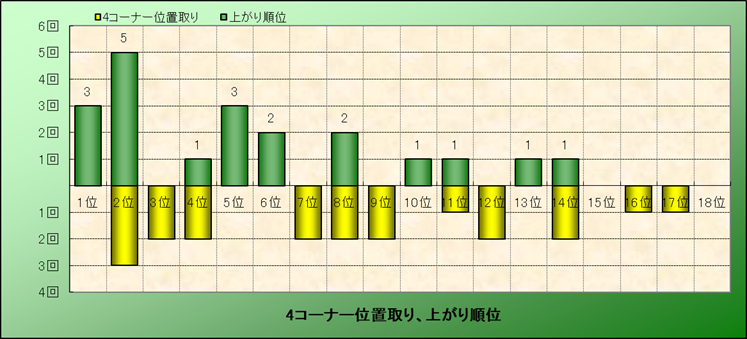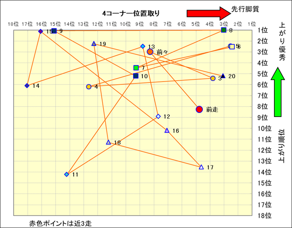 脚質解析 近20レースの4コーナーでの位置取りと上がり順位(頭数補正後) |