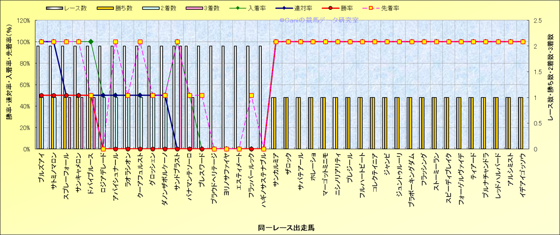 ライバル(相性)解析 同一レースに下記馬が出走した場合の成績とその馬に先着する先着率 |