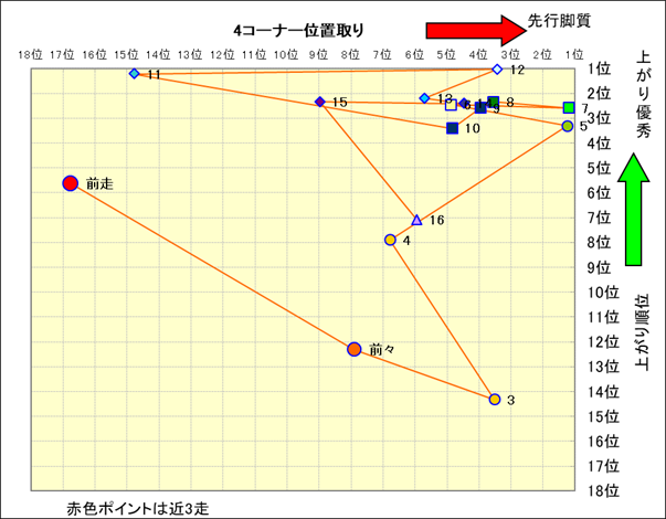 近走における4コーナーでの位置取りと上がり順位(頭数補正後) |