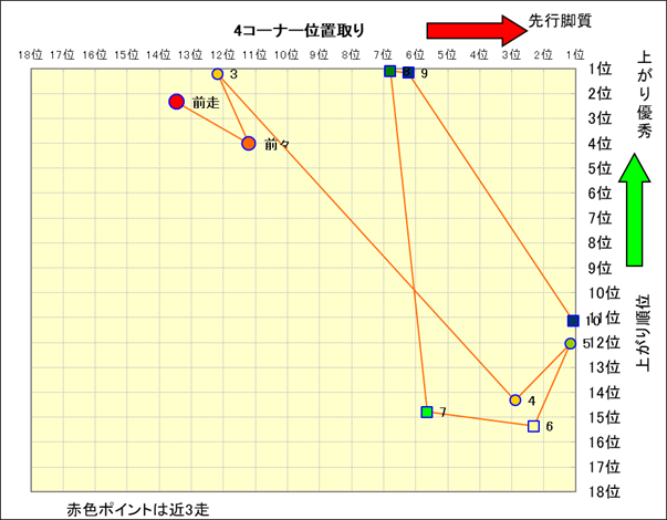 近走における4コーナーでの位置取りと上がり順位(頭数補正後) |