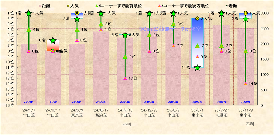 近走における4コーナーでの位置取りと上がり順位(頭数補正後) |