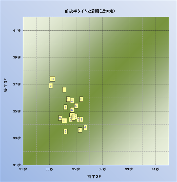 脚質解析 近20レースの4コーナーでの位置取りと上がり順位(頭数補正後) |