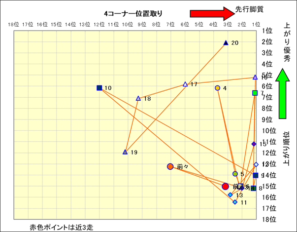 近走における4コーナーでの位置取りと上がり順位(頭数補正後) |