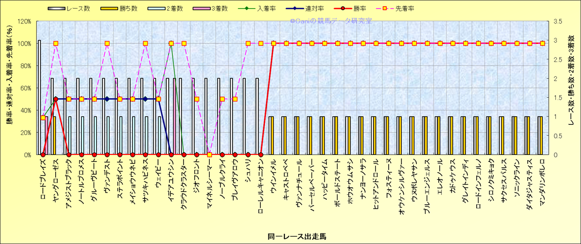 ライバル(相性)解析 同一レースに下記馬が出走した場合の成績とその馬に先着する先着率 |
